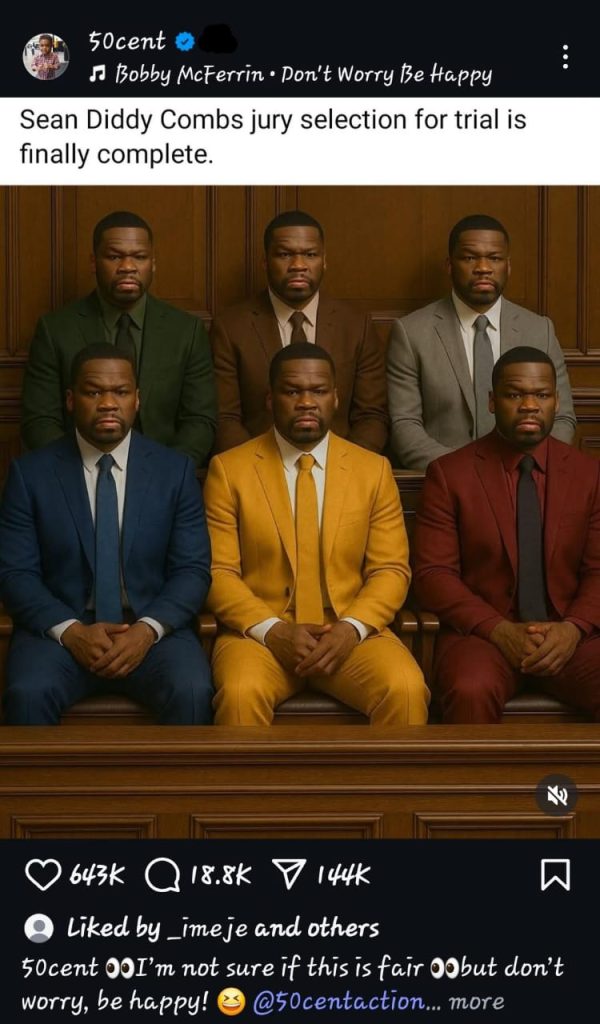 Last week, as jury selection kicked off, 50 dropped a wild meme on his socials: an AI-generated image showing him as every single juror in the box. That’s right, twelve different versions of 50 staring down Diddy in the courtroom. The caption? “Sean Diddy Combs’ jury selection for trial is finally complete.” Then, with his signature sarcasm, he added, “I’m not sure if this is fair, but don’t worry, be happy!”