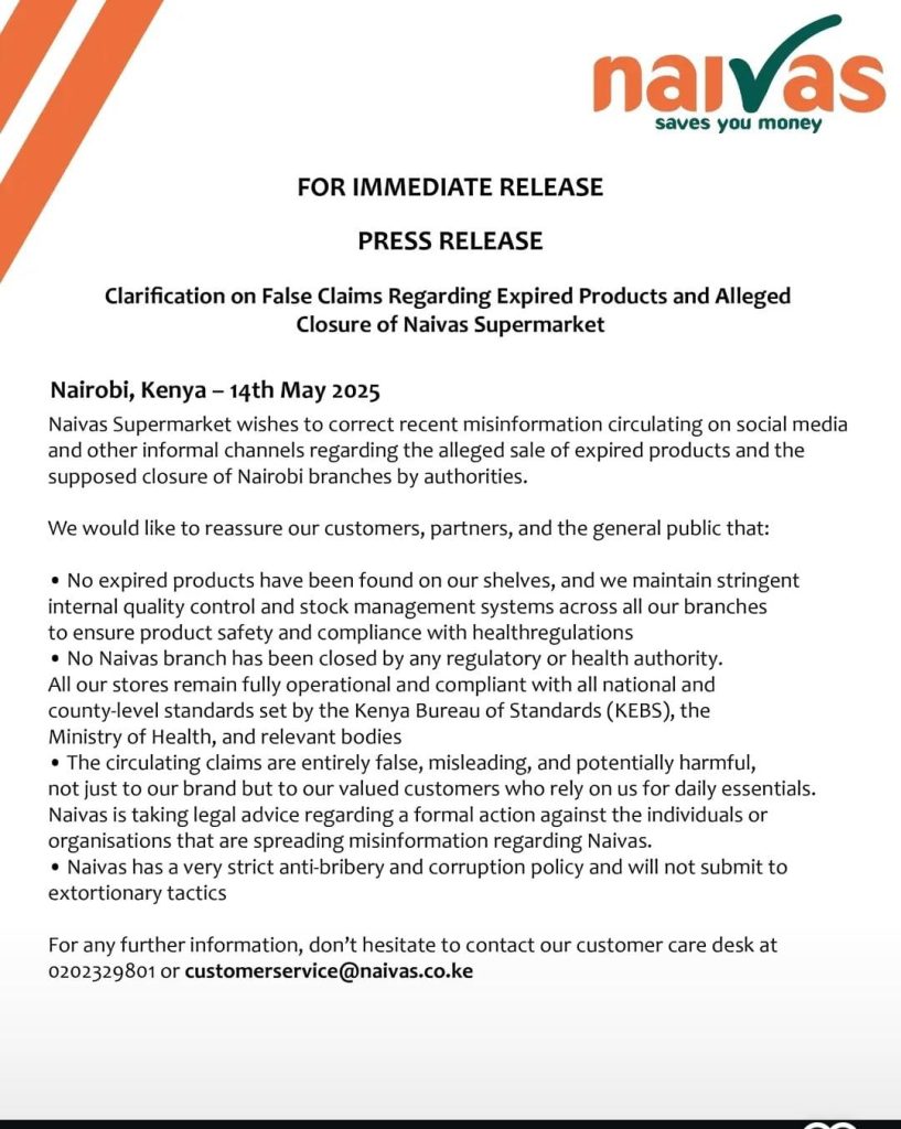 In a swift and firm response, the supermarket chain dismissed the claims as baseless and misleading. Naivas emphasized its commitment to safety and quality, pointing to robust internal systems for inventory control and adherence to national standards set by agencies like the Kenya Bureau of Standards (KEBS) and the Ministry of Health.