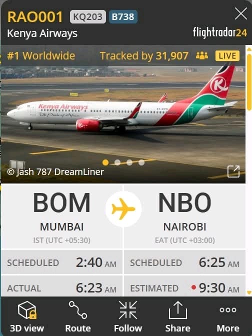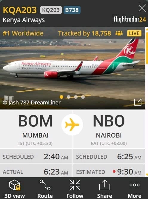 The flight, which departed from India earlier today, is expected to land at JKIA at around 9:30 a.m.