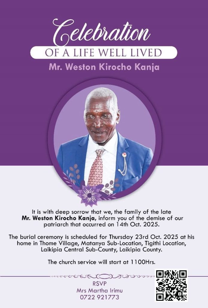Mzee Kirocho will be laid to rest on Thursday, October 23, at his family home in Thome Village, Matanya Sub-Location, Tigithi Location, Laikipia County. His passing came just a day before the country mourned another national figure, former Prime Minister Raila Odinga, who succumbed to cardiac arrest in India. The back-to-back losses cast a somber mood across Kenya, especially as Kanja joined other dignitaries in paying final respects to the ODM leader.