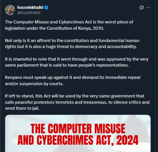 Hussein Khalid Slams Cybercrimes Act as Kenya’s Worst Law Under 2010 Constitution