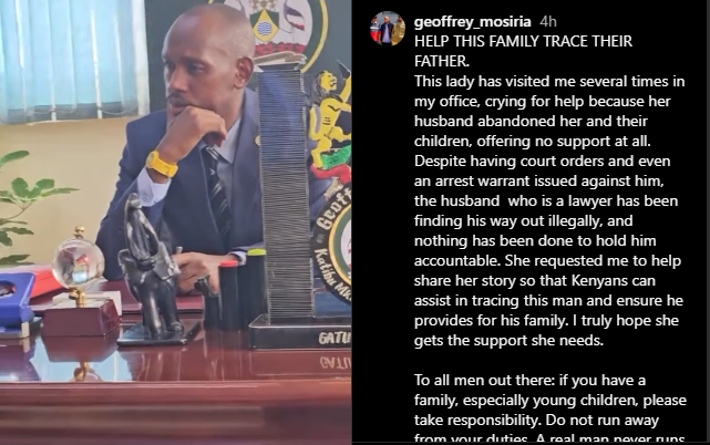 Mosiria explained that the husband, a lawyer, has been “finding his way out illegally,” leaving the woman and her children struggling. The woman asked Mosiria to share her story so that the public could help trace the man and ensure he fulfills his responsibilities. “This lady has visited me several times in my office, crying for help because her husband abandoned her and their children, offering no support at all. Despite having court orders and even an arrest warrant issued against him, the husband, who is a lawyer, has been finding his way out illegally, and nothing has been done to hold him accountable. She requested that I help share her story so that Kenyans can assist in tracing this man and ensure he provides for his family. I truly hope she gets the support she needs,” Mosiria said.