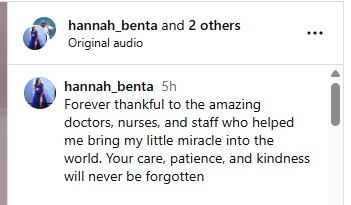 “Forever thankful to the amazing doctors, nurses, and staff who helped me bring my little miracle into the world. Your care, patience, and kindness will never be forgotten,” Benta wrote.