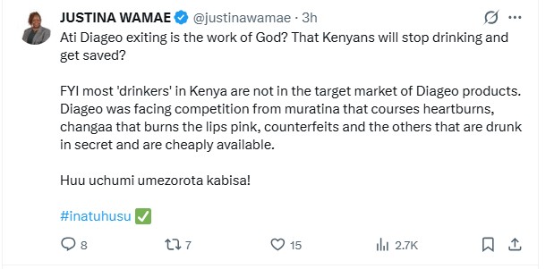 “Is Ati Diageo exiting the work of God? Will Kenyans stop drinking and get saved? FYI, most ‘drinkers’ in Kenya are not in the target market of Diageo products,” Wamae said. Her remarks immediately drew attention online, with many Kenyans weighing in on the long standing divide between formal alcohol producers and the informal market.