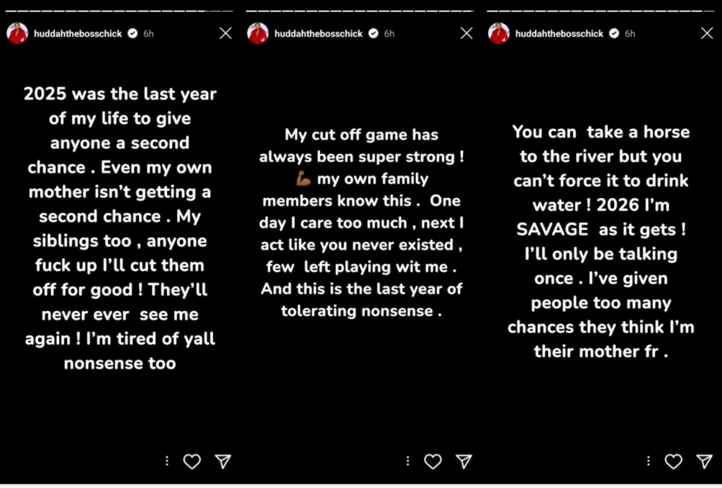 Looking ahead, Huddah described 2026 as her most decisive year yet. She made it clear that negativity, drama, and repeated offences will no longer be tolerated under any circumstances. Using a familiar saying to explain her position, she emphasised that responsibility for growth lies with each person. “You can take a horse to the river, but you can’t force it to drink water! In 2026, I’m SAVAGE as it gets! I’ll only be talking once. I have given people too many chances; they think I’m their mother,” she added.